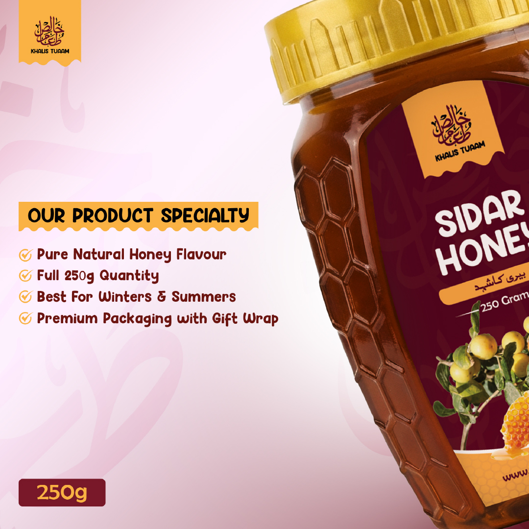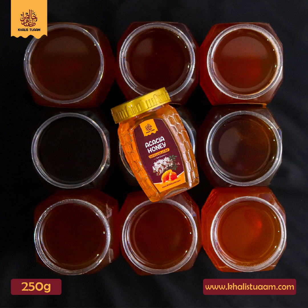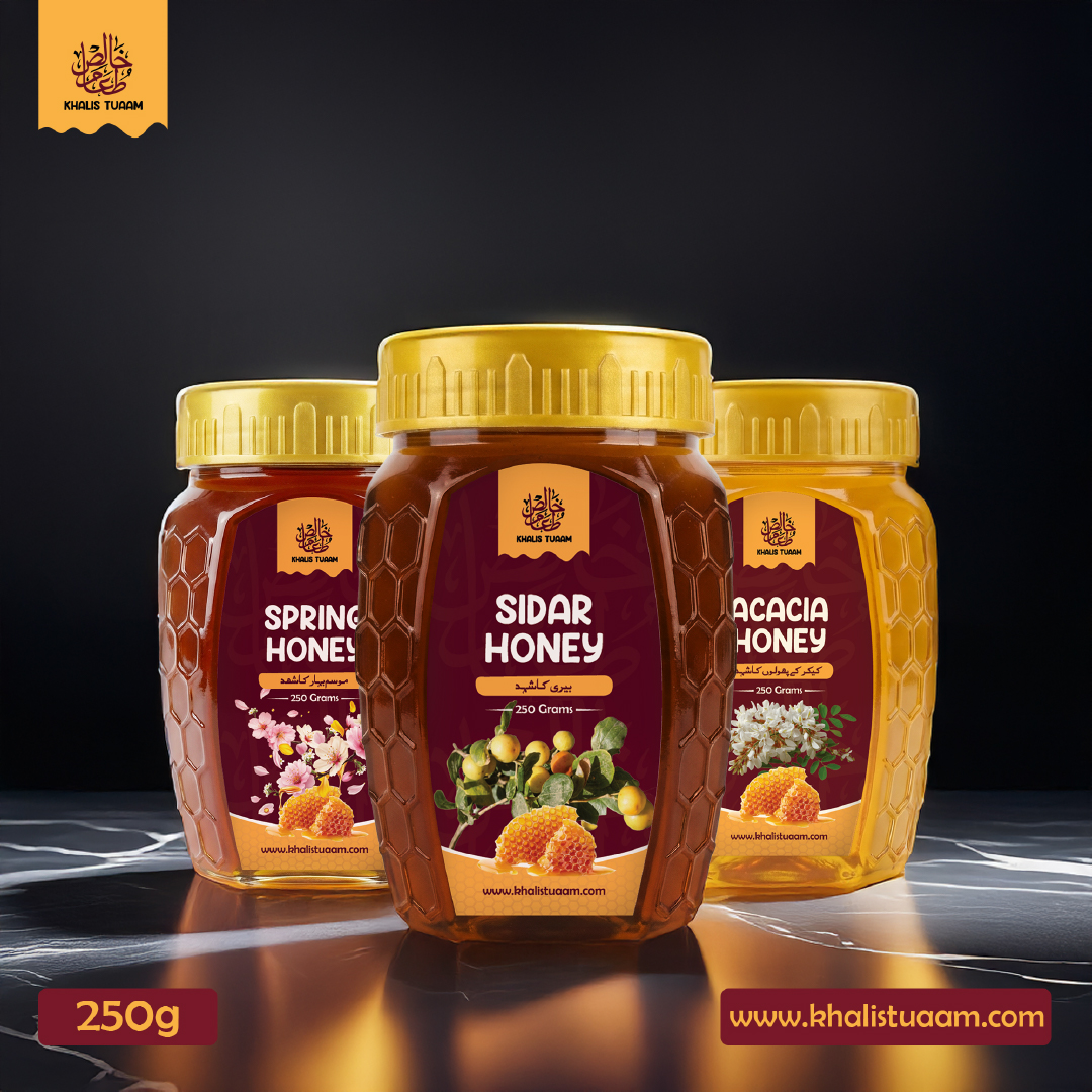 Discover the authentic taste of Pakistan’s finest honeys in one jar with Khalis Tuaam’s 3-in-1 Honey Combo. This 250g combo pack features: